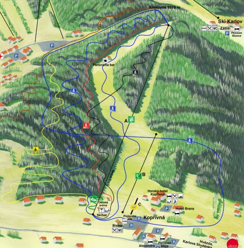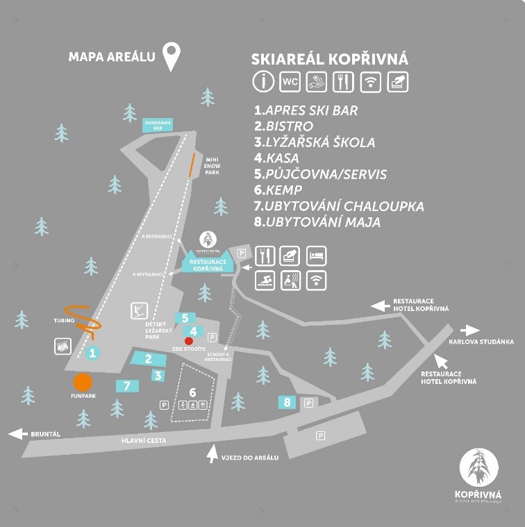 Lyžovat můžete přímo na sjezdovce, která se nachází přímo u našich apartmánu nebo z druhé strany kopce naleznete další lyžařský areál Kopřivná.